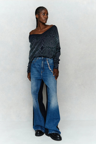 MAGLIA IN JACQUARD LAMÉ CON POSSIBILITÀ DI DOPPIO USO, MANICHE DOLMAN, VESTIBILITÀ SLIM, LUNGHEZZA ALLA VITA.
