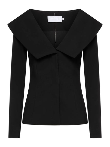 Giacca dal taglio aderente in golden crepe con collo oversize. Maniche lunghe aderenti e abbottonatura nascosta.