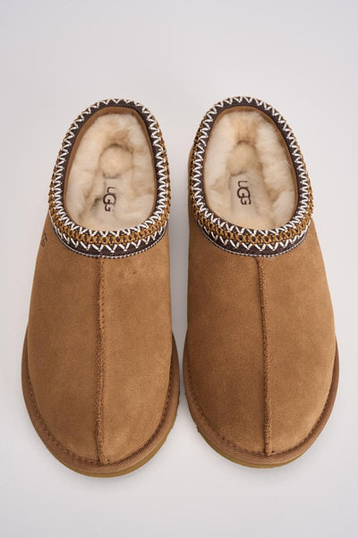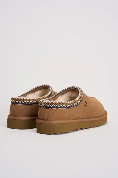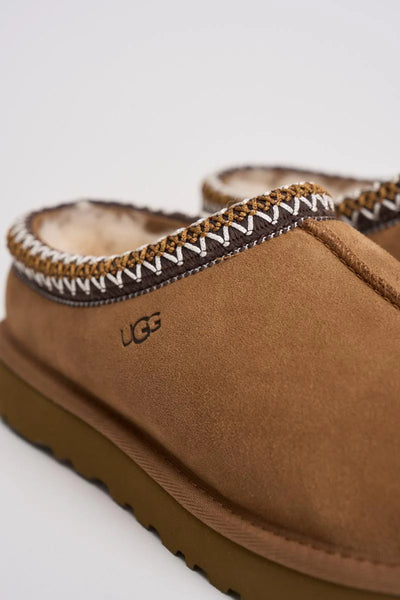 UGG Stivale donna platform Tasman II chestnut. Modello sabot in pelle scamosciata, foderata in montone. Logo Ugg impresso a caldo. Treccia UGG Tasman (70% poliestere riciclato, 30% rayon). Suola in EVA 1.5cm. Rilegatura in tessuto realizzata con fibre di poliestere riciclate al 100% marroni e bianche. Calzata regolare.