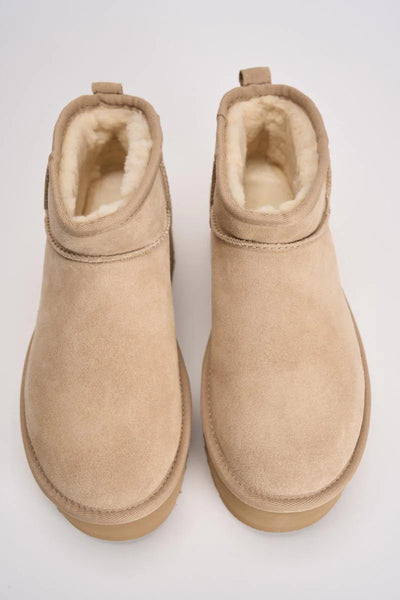 UGG Stivale donna platform Ultra mini beige. Suola in gomma 50mm. Tomaia in camoscio. Tirante posteriore. Dettagli in camoscio sul tallone.