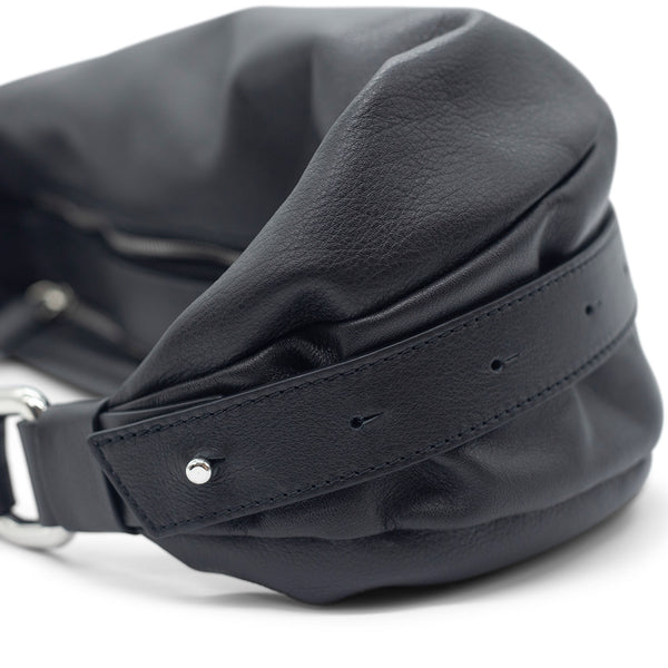 BLACK HALF-MOON BAG, MADE OF SOFT CALF LEATHER, WITH LEATHER HANDLES, ADJUSTABLE AND OPENABLE STRAP TO ALSO WEAR IT AS A BELT BAG. DOUBLE COMPARTMENT WITH METAL ZIPS.